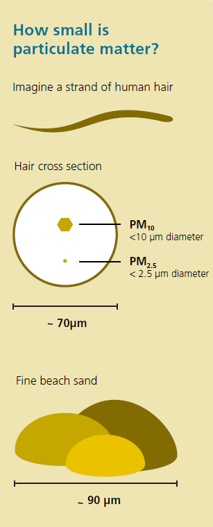 Particles are classified by their size with PM10 referring to inhalable particles smaller than 10 microns (μm) in diameter. Of the inhalable particles, those smaller than 2.5 microns (PM2.5) can penetrate more deeply into the respiratory system and therefore pose the greatest risk to health (see diagram of particle sizes).